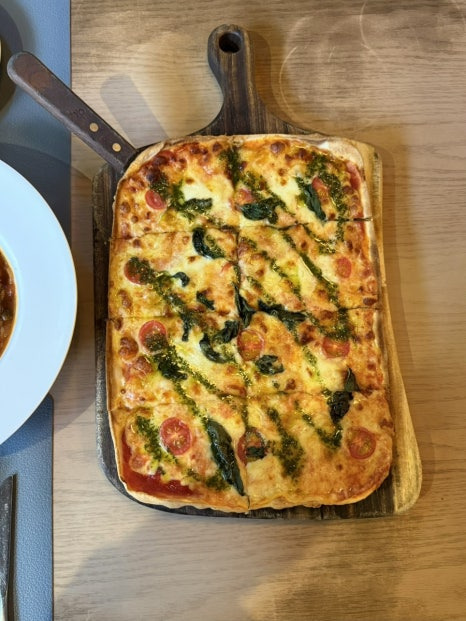 바질과 토마토, 모짜렐라 치즈를 토핑한 피자